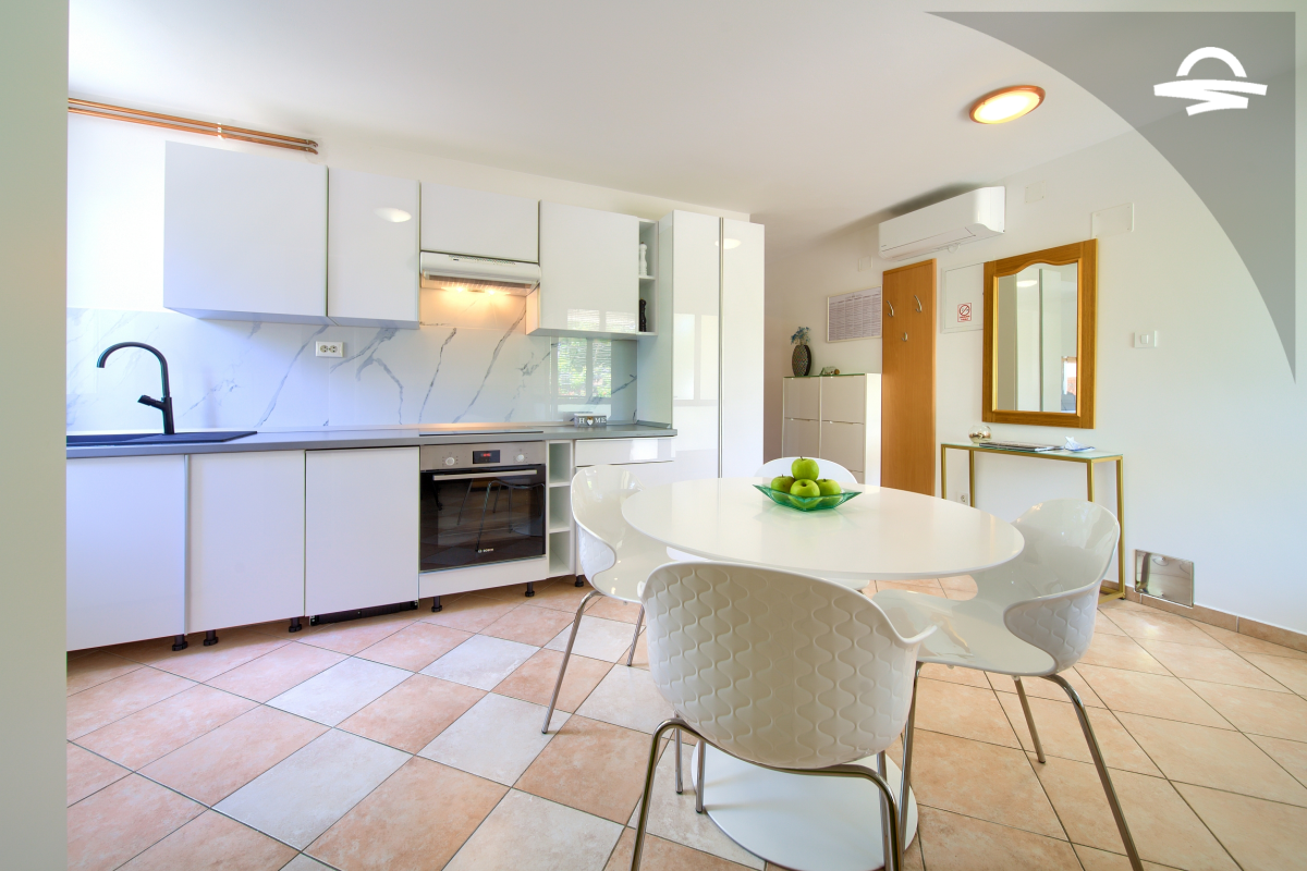 Since the apartment has 45 m2 it is very spacious and can accommodate 2 persons. It consists of well equipped kitchen and living room, one double room, bathroom with shower, and terrace of 6 m2 on the sea side. The additional facilities that you can find in this apartment are air condition, WiFi, SAT-TV, common barbecue and one parking place in the garden.