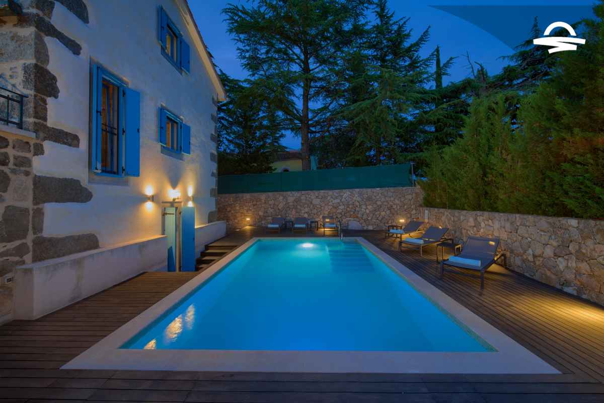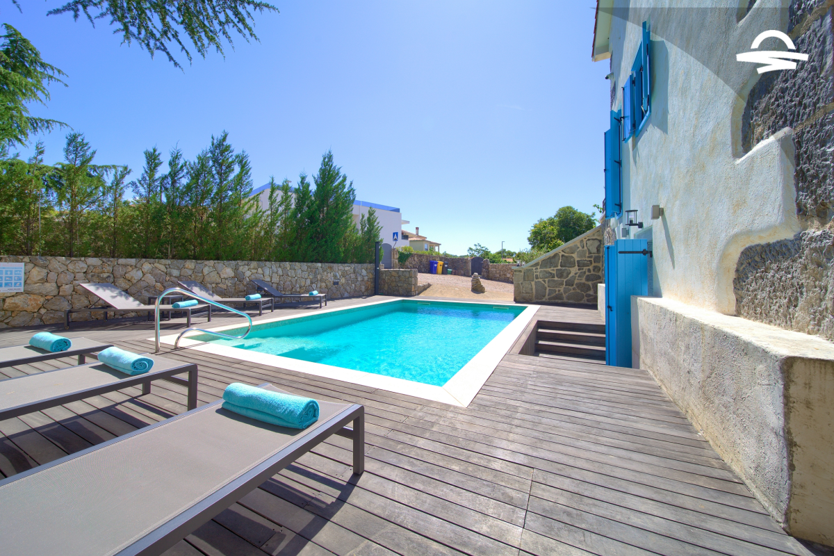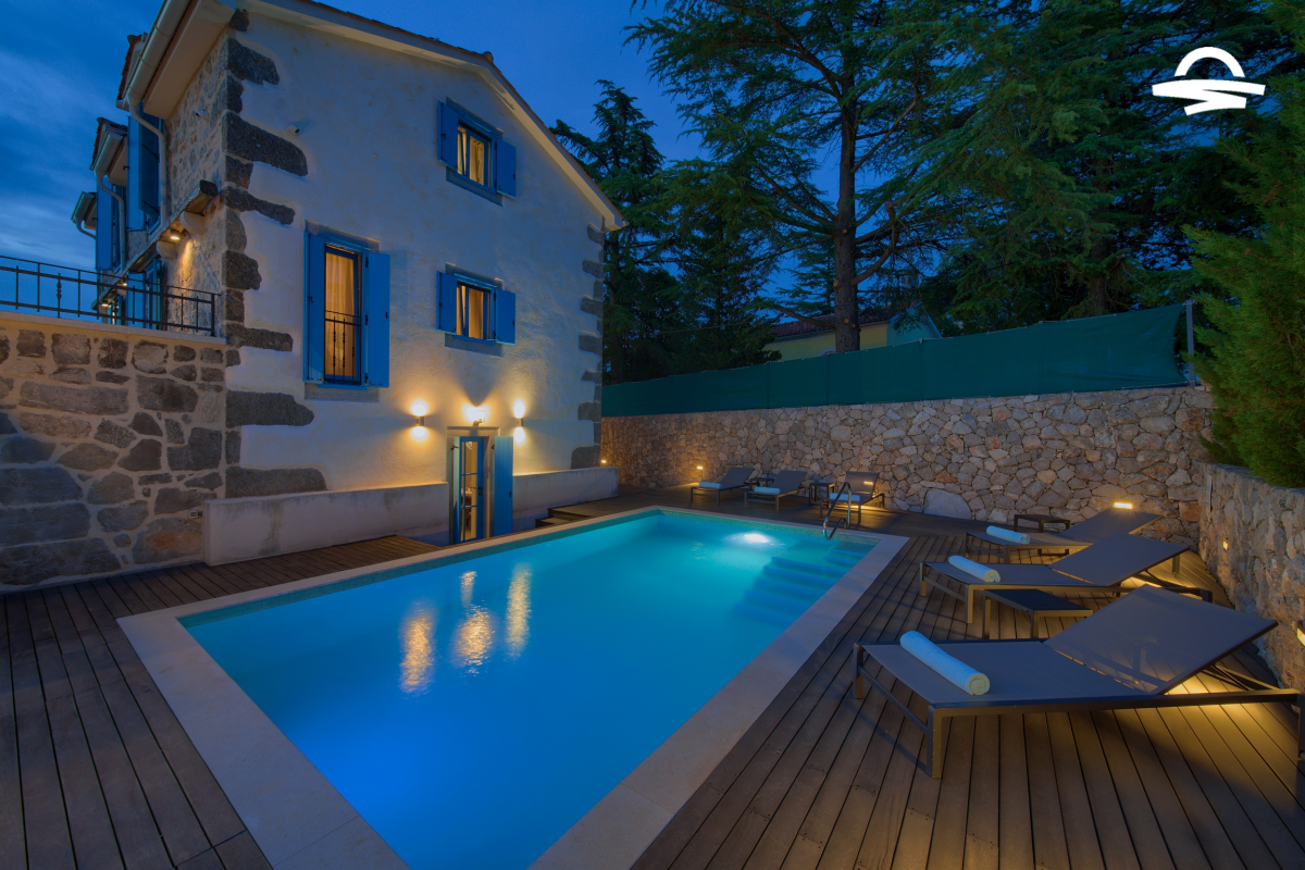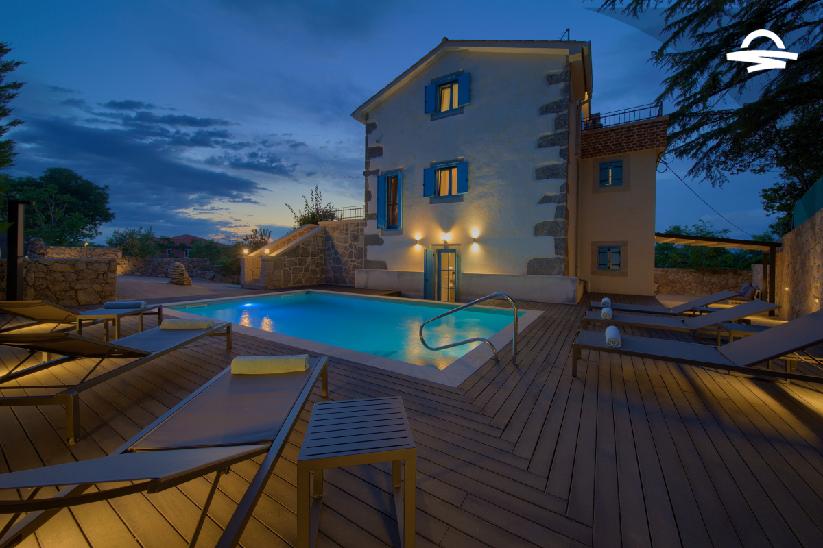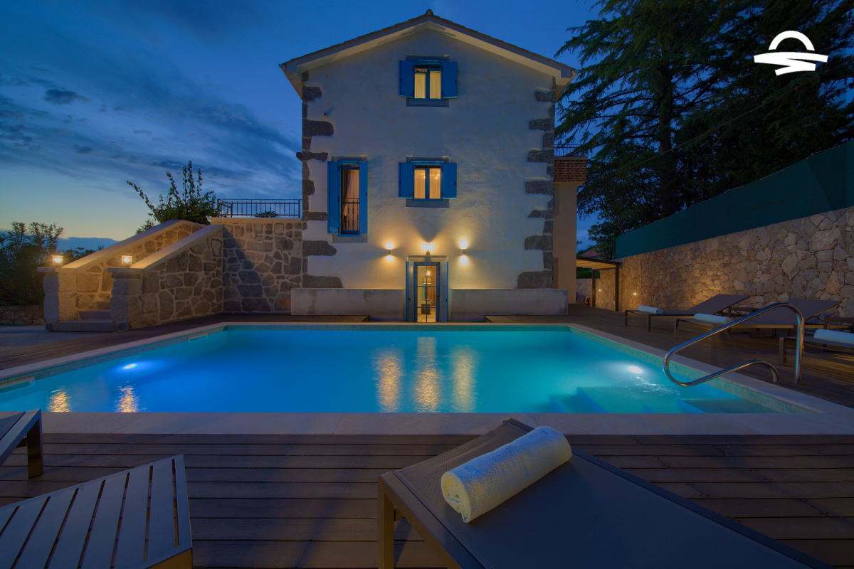 Within 5 km of Krk Bus Station and harbour, luxury Villa Ive features 4 bedrooms, 4 bathrooms a heated pool of 28 m2 with salt water, a counter-current swimming system, a wellness area with Finnish sauna and infrared sauna inside the house, a wooden sun terrace with an outdoor shower, a big grill, a solid wooden table coverd by a pergola, free WiFi along with many other facilities.