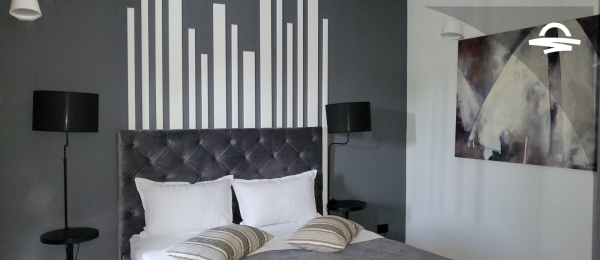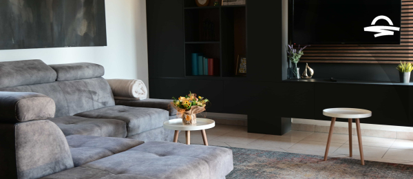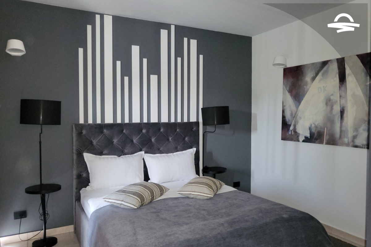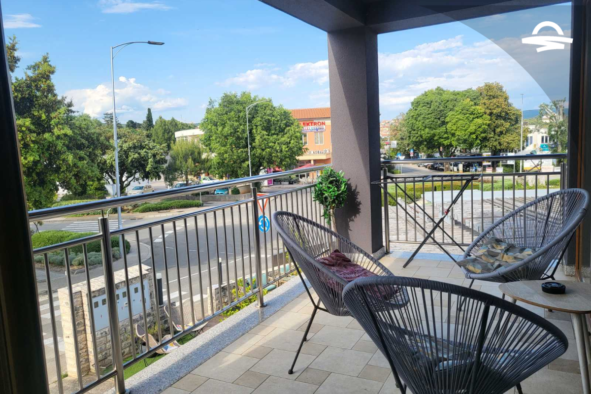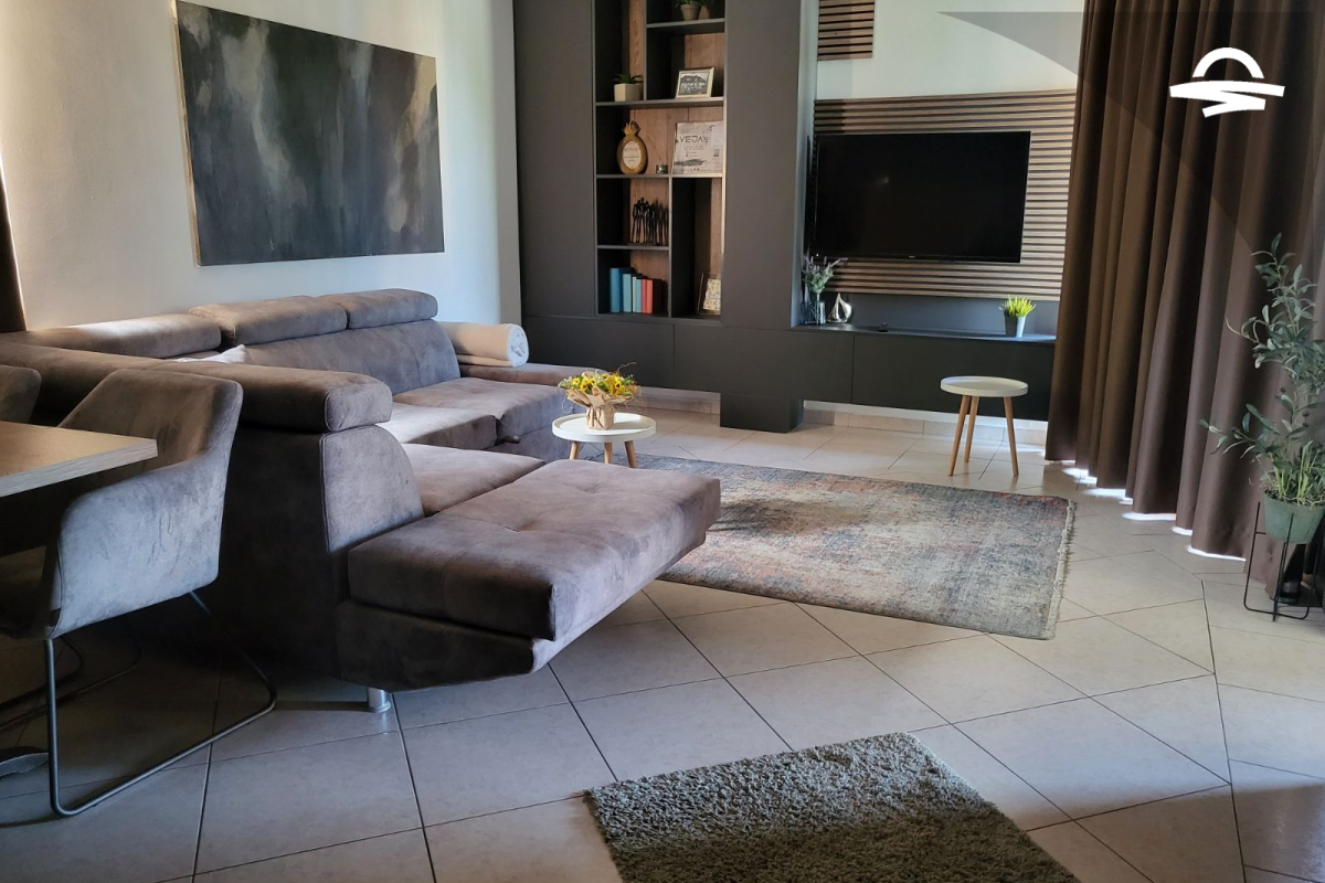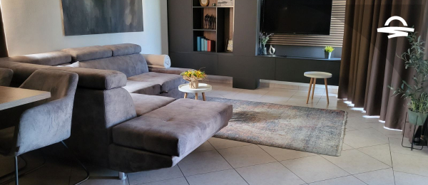 Modern spacious apartment with living room, bedroom, kitchen, bathroom and balcony.