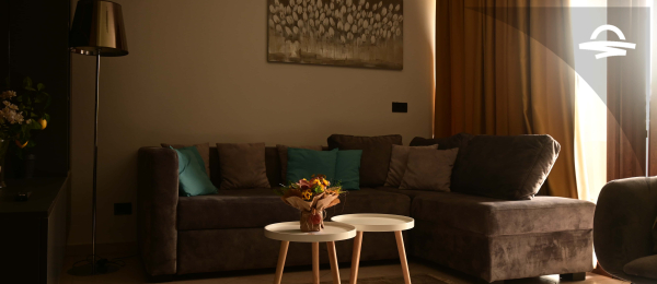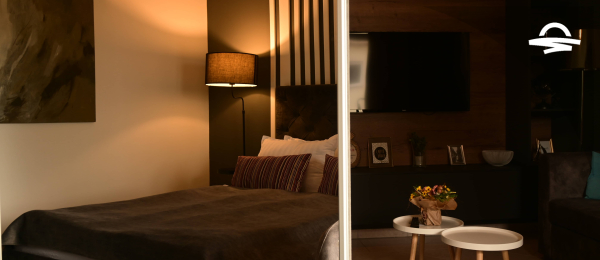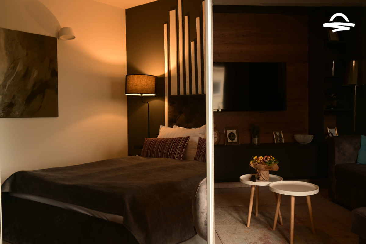Modern spacious apartment with living room, bedroom, kitchen, bathroom and balcony.